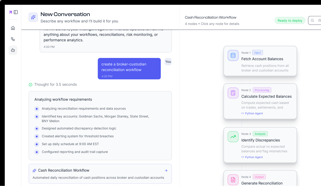 Create autonomous workflows for custom reporting, reconciliation, analytics, and alerting. No code.